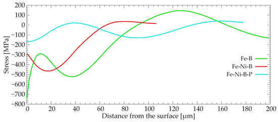 The stress analysis results in the tested Fe-B, Fe-Ni-B-P and Fe-Ni-B boride layers on C45 steel and the substrate are shown in Figure 9. As can be seen, compressive stresses occur in all layers, although their distribution and values are different. The stress distribution in the Fe-B-type iron boride layers has the most complex oscillatory course, with a maximum of c.a. −700 MPa right at the surface and another maximum of c.a. −550 MPa at a distance of approx. 40 µm in the zone adjacent to the substrate. One should notice that the stress distribution in the voids occurring in the c.a. 25 µm large region below the outside (Fe, Ni)B boride zone (Figure 1a) may be difficult to interpret. A zone of unfavourable tensile stresses appears in the substrate under the Fe-B layer, with the maximum at a distance of c.a 120 µm from the surface. As can be seen, the presence of nickel in the boride layers reduces the value of maximum compressive stresses, with the lowest level (above approx. −150 MPa) being observed in multicomponent boride layers of the Fe-Ni-B-P type. The above observation correlates with the decrease in stress in the boride phases in this layer, as reported by Fillt et al. [43]. The stress level in compressive multicomponent layers is almost three times lower than in Fe-Ni-B layers (max. c.a. −450 MPa), which may be related to the presumed stress relaxation in the phosphide (Ni, Fe)3P areas present in them (Figure 3) that are much less hard than borides. Both variants of boride layers containing nickel show a gradual decrease in compressive stresses deep into the layer and a slight, practically close to zero, level of tensile stresses.