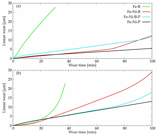 The effect of composition on the linear wear of the boride layers for Fe-B, Fe-Ni-B and Fe-Ni-B-P and unborided Fe-Ni-P layer annealed at 850 °C for 2 h: the load 200 MPa (a), the load 400 MPa (b).