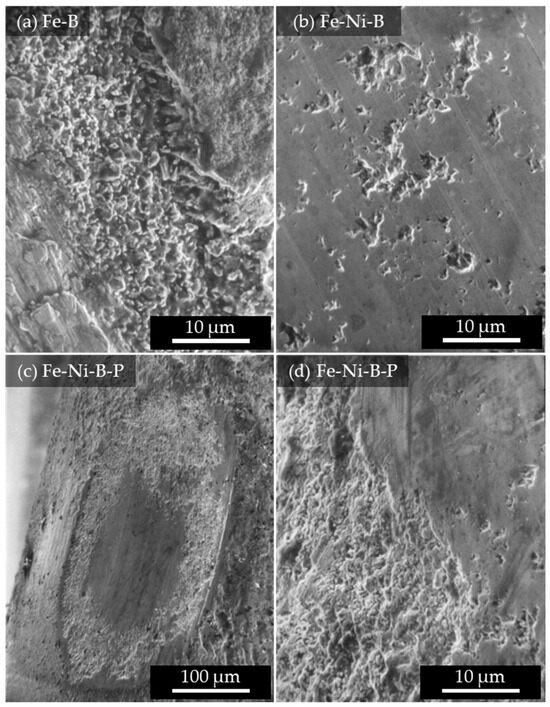 The tested samples were also subject to SEM observations (Figure 11). The observations show that the iron boride Fe-B-type layers and the multicomponent Fe-Ni-B-P-type nickel boride layers exhibit a visible tendency for spalling (Figure 11a,b). The spalling effect is particularly extensive in the iron boride layers’ case (Figure 11a). In the case of the multicomponent boride layer, a slightly lower surface area seems to be damaged (Figure 11c). The observed spalling effect in both cases is probably related to the low cohesion in the outside boride zone of the layer, which is composed of the most harmful brittle FeB or (Fe, Ni)B-type phase separated from the substrate by the large voids zone between boride needles. The decohesion of the superficial, wear-resistant layer of the boride layer exposes the deeper zones of the layer susceptible to seizing observed in the wear test (Figure 11). The Fe-Ni boride layers also crack during the bending test (Figure 12c); however, this process does not lead to the layers’ fragments’ decohesion (Figure 12c).