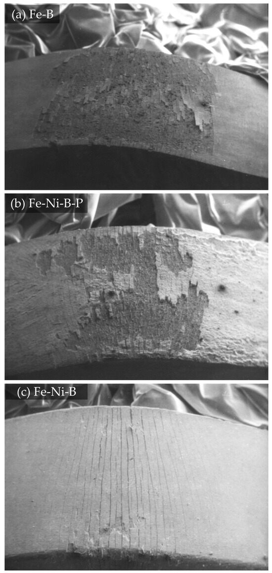 The surface view of the bending tested samples with the Fe-B (a), Fe-Ni-B-P (b) and Fe-Ni-B (c) boride layers.