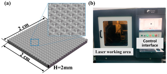 As for the microstructure’s morphology on the surface, the convex hull structure of the array arrangement was chosen. The schematic diagram for the design is shown in Figure 2a. The microstructure’s size was about 20 μm. The surface microstructure was prepared using a laser micromachining system, as shown in Figure 2b. The rated power of the laser in this system was 5 watts, and the thermal-affected zone which it generated was at the micrometer level. Its minimum spot size was around 5 μm, allowing for the engraving of micrometer-scale features.