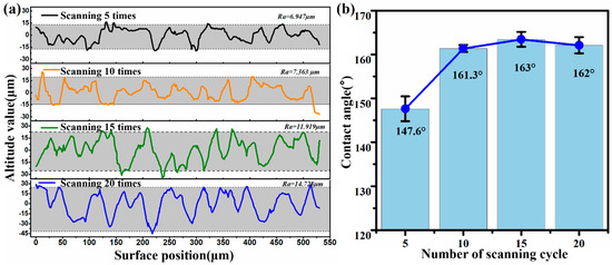 The influence of the number of scanning cycles on the surface: (a) the degree of roughness; (b) the water contact angle.