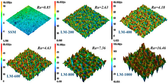 The morphology after laser engraving was captured using a laser confocal measuring microscope (VK-X1000). The results are shown in Figure 4.