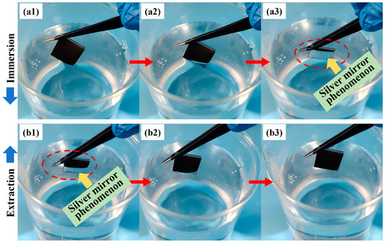 Silver mirror phenomenon during immersion (a1–a3) and extraction (b1–b3) of superhydrophobic LM-800 sample.