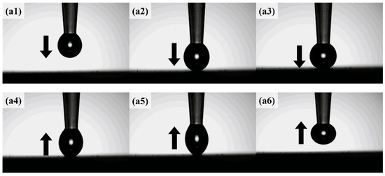 From Figure 7(a2,a3), it can be observed that when the sample came into contact with the water droplet, the water droplet underwent deformation due to the compression on the sample surface. As the sample slowly descended with the loading stage, the bottom of the water droplet was elongated (Figure 7(a4,a5)), and the droplet detached from the surface of the sample without adhesion occurring.