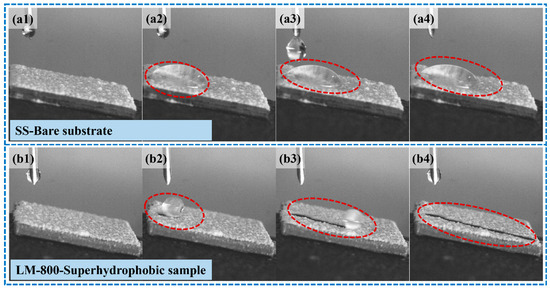 Self-cleaning test from a side shot view: (a1–a4) bare stainless steel substrate sample; (b1–b4) superhydrophobic sample.
