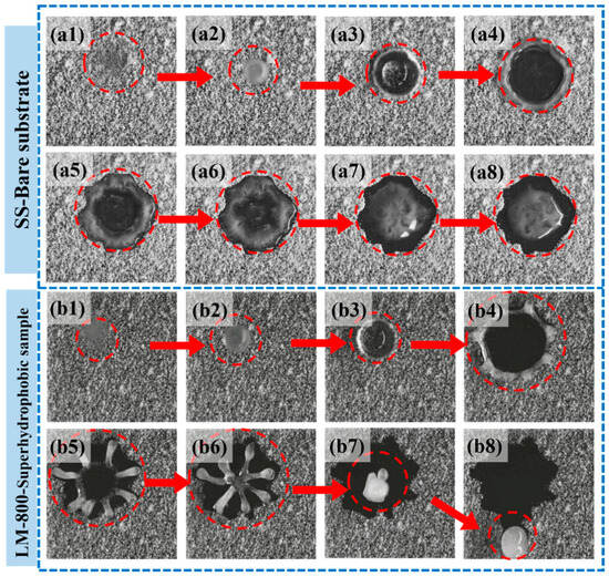 Self-cleaning test from an overhead view: (a1–a8) bare stainless steel substrate sample; (b1–b8) superhydrophobic sample.