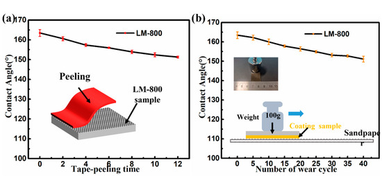 The test results are shown in Figure 10. The contact angle of the sample slightly decreased, but the values remained above 150°, indicating that the superhydrophobicity was still maintained. The reason for the slight decrease in the contact angle may be attributed to the fact that the surface-engineered microstructures provided more physical attachment points for myristoleic acid, resulting in higher binding strength. As a result, it was less prone to removal during the peeling and tearing action of the tape. Additionally, the chemical branches of COOH groups in myristoleic acid form stable complexes on the surface, providing stability and resistance against the peeling action of the tape.