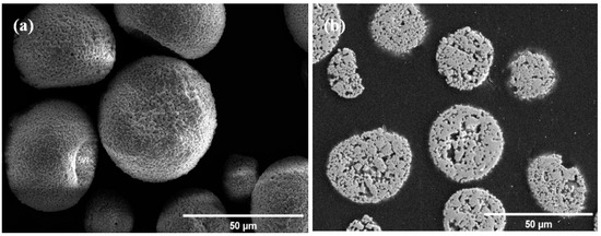 SEM images of surface (a) and cross-sectional (b) morphology of Powder #2.