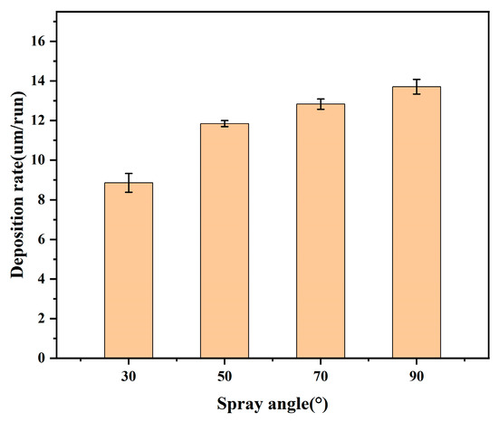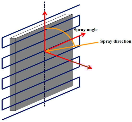 An optimal coating performance is typically achieved when the spraying angle is 90° [8,9]. However, the spraying process may not ensure a fully vertical spraying angle due to the intricate shape of the workpiece, unreasonable trajectory planning, and constraints imposed by the spraying machine’s structure. Variations in spraying angles can alter the direction of impact of sprayed particles on the substrate surface, resulting in a shielding effect and affecting the spreading morphology of the spraying particles, ultimately leading to changes in the structure and performance of the coatings [10]. Some studies have been carried out on the impact of the spray angle on the structure and performance of coatings. These studies mainly focus on high-velocity oxy-fuel (HVOF) spraying and APS technologies, which are commonly employed for TBC deposition. As the HVOF spraying angle decreases, the spreading of the spraying particles onto the substrate will generate additional elongation along the spraying angle, resulting in an increase in the defects and porosity of the coating and a decrease in the microhardness and elastic modulus [9,11]. The rise in horizontal velocity leads to a greater number of particles bouncing off and sliding away, which ultimately causes a reduction in the efficiency of the coating deposition [9,11]. The erosive effect of the particles themselves and the rebounding of high-speed, unmelted particles at low angles both reduce the roughness and friction coefficient of coatings [12]. Correspondingly, the coating exhibits good water lubrication wear performance [13]. The dry sliding wear performance of the coating is observed to decrease as a result of the increase in pore cracks [14]. APS provides a similar conclusion to HVOF spraying. As the angle decreases, the powder deposition morphology will change along the direction of the spraying angle, and the maximum thickness of the spray bead will also decrease [15]. In comparison to HVOF, APS has a smaller spray particle speed, and the shot blasting effect and erosion effect are not obvious, which increases the coating porosity and decreases the thermal conductivity at low angles [8]. For suspension plasma spraying (SPS), under the condition of a low spraying angle, the coating will produce columnar microstructures inclined along the spraying angle, resulting in a decrease in the erosion resistance and thermal shock life of the coating [16]. As observed from the previously described examples, investigating the alterations in the coating structure and performance when exposed to varying spraying angles holds considerable importance in directing the practical spraying procedure.