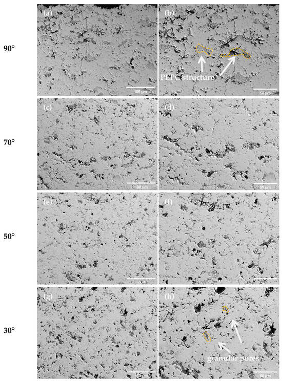 - With a decrease in the angle, there is a corresponding reduction in the PEPC structure within the coating, leading to an increase in the number of granular pores in the first phase matrix. In comparison to the PEPC structure, the granular pores in the first phase matrix exhibit reduced area and aspect ratio.