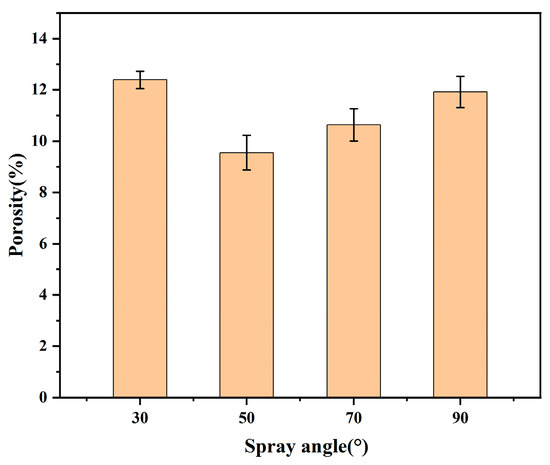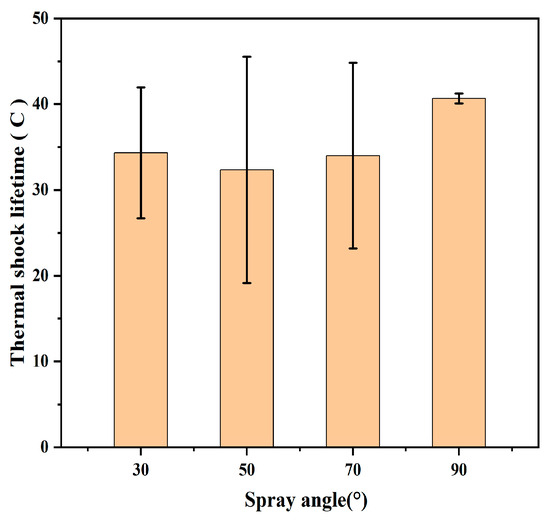 Figure 13 shows the thermal shock life of EMAP coatings under different spraying angles. Figure 13 demonstrates that the coating achieves its highest average thermal shock life of 40.6 cycles at a spraying angle of 90°. The difference between the best and worst samples is only one cycle, indicating excellent thermal shock life stability. At a spraying angle of 70°, the average thermal shock life decreased to 34 cycles, and the difference between the best and worst samples was 21 cycles. This led to a notable decrease in the stability of the thermal shock life. At a spraying angle of 50°, the average thermal shock life decreased to 32 cycles, with a notable difference of 26 cycles between the best and worst samples. This further diminished the stability of the thermal shock life. At a spraying angle of 30°, the average thermal shock life increased to 34.3 cycles, and there was a 15-cycle difference between the best and worst samples. The thermal shock life stability also experienced an increase. It can be seen that there exists a similar trend between alterations in the average thermal shock performance of coatings and variations in the porosity of the coatings.