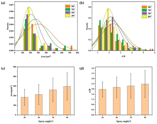 The distribution of area and aspect ratio for two different types of pores at varying angles (a,b), together with the corresponding averages for area and aspect ratio (c,d).