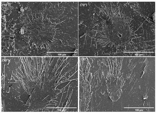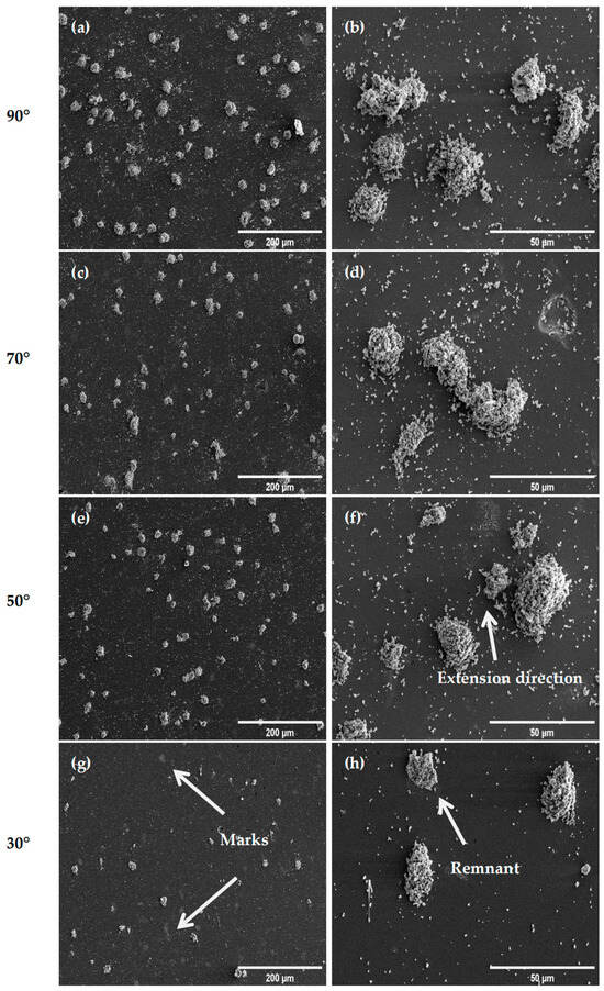 The morphology and relative quantities of the second phase powder sprayed onto a mirror substrate at various spraying angles are illustrated in Figure 8 and Figure 9, respectively. The results demonstrate that at a spraying angle of 90°, the substrate has the highest amount of second phase powder embedded (Figure 8a), with a maximum relative quantity of 10.8%. This phenomenon may be responsible for most of the PEPC structures and the greater porosity in the coating when sprayed at a spraying angle of 90°. Additionally, the powder exhibits a uniformly dispersed morphology towards the surrounding areas (Figure 8b), which aligns with the PEPC structure observed in the coating. When the angle reduces to 70° and 50°, the quantity of second phase powders embedded decreases, with relative amounts of 7.8% and 7.3%, respectively. This decrease corresponds to a reduction in the PEPC structure in the coating cross-section at both angles. Meanwhile, the difference in powder quantity between the two angles is minimal, which may explain the similar coating structures observed at 70° and 50°. In addition, the powder has a slight extension of powder spreading towards the direction of the spraying angle. The substrate exhibits marks of powder particles sliding and rebounding, with certain particles displaying reduced volumes and irregular morphologies (Figure 8c–f). There is a speculation that the observed phenomenon might be attributed to the heightened tangential velocity component of the second phase powder when spraying at lower angles, which leads to a significantly greater tendency towards powder fragmentation and rebound. The research conducted by Fefekos et al. [22] also demonstrated that ceramic powders exhibit a higher susceptibility to fracture and rebound when sprayed at lower angles. At an angle of 30°, there is a notable reduction in the amount of second phase powder present on the substrate (Figure 8g), with a relative quantity of only 2.2%. The embedded second phase powder is primarily composed of remnants from the rebounding process (Figure 8h), demonstrating that the rebound and sliding of the second phase powder are the most apparent at this angle. Despite the resemblance of these remnant powders to granular pores in terms of their morphology, the porosity of the coating cannot be enhanced due to the minuscule quantity of embedded powders. This indicates that these remnants cannot serve as the main sources of granular pores in the coating at 30°, which more directly supports the validity of the prior inference.