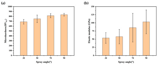 Hardness (a) and elastic modulus (b) of coatings at different spraying angles.
