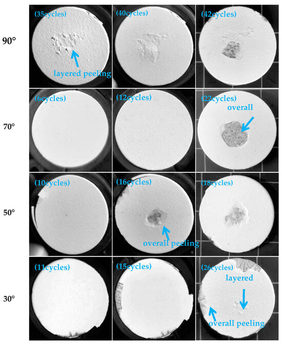 Figure 14 shows the typical failure process of EMAP coatings from different angles. When the spraying angle is 90°, layered peeling occurs at the center of the coating as the number of thermal cycles increases. Then, as the number of thermal cycles increases, the peeling area continues to expand. Overall peeling happens as the coating becomes close to the thermal shock life. After the onset of overall peeling, there is a notable acceleration in the rate of coating peeling, leading to a rapid attainment of the failure state. This phenomenon occurs in the thermal shock process of all 90° specimens. The specific reason for coating delamination is attributed to the formation and propagation of cracks along the interface between the coating matrix and the embedded particle area, as a result of thermal stress induced during the thermal shock cycle [23]. Similar phenomena have also occurred in our previous studies [19], which belong to the normal failure process of EMAP coatings. In fact, the same process occurs at spraying angles of 70° and 50°, and when the layered peeling failure process takes place, the thermal shock life of the coating can essentially reach about 40 cycles, which is comparable to the thermal shock life of the coating at spraying angles of 90°. In contrast to the coating observed at a spraying angle of 90°, the coating at spraying angles of 70° and 50° displays a distinct failure process. Specifically, the overall peeling of these coatings occurred at a lower number of cycles without layered peeling and rapid reach failure. Currently, the thermal shock life of the coating is typically reduced to approximately 20 cycles, representing only 50% of its lifetime at 90°. The outcome of this phenomenon is a reduced average thermal shock life and suboptimal stability in the coatings at 70° and 50° in comparison to those at 90°. It is notable that this effect is more pronounced at 50° than at 70°. At an angle of 30°, the coating will simultaneously exhibit layered peeling at the centre and overall peeling at the edge. The thermal shock life of a coating is limited to approximately 26 cycles when the failure manifests as edge peeling. The thermal shock life of a coating can increase significantly, up to approximately 36 cycles, when the failure of the coating occurs in the form of layered peeling. Compared to the 90° angle, the thermal shock life of the layered peeling failure process of the 30° coating is relatively diminished.