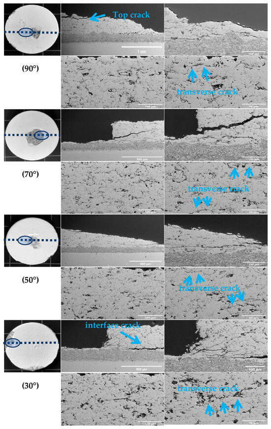 Fracture morphology and cross-sectional microstructure of failed coatings at different angles.