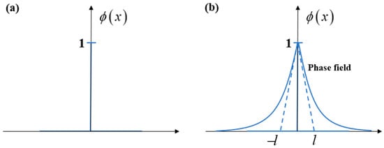 It is named the fracture phase field, where and represent the intact and completely broken states of the material, respectively. For the fracture phase-field method, Miehe et al. [] proposed an exponential function with a diffusion property, which can be used for the phase field.