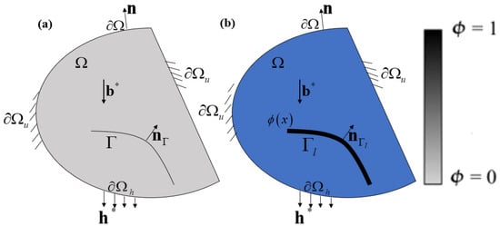 Schematic diagram of a cracked solid: (a) internal discontinuous crack; (b) phase-field approximation of the crack.