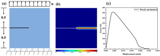 Free quadrilateral mesh cells with are used. Figure 5b shows the crack growth. The deeper the color represents the greater the damage degree. Figure 5c demonstrates load–displacement curves under purely mechanical loading.