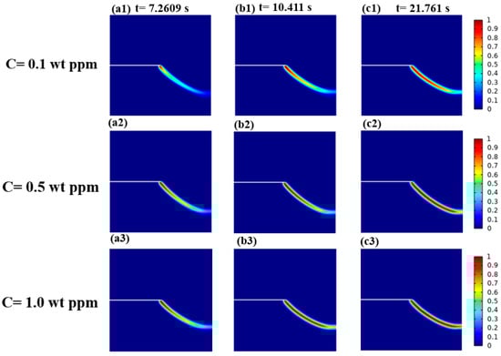 Figure 31 illustrates the crack propagation of the phase field under mechanical–chemical coupling. The crack nucleates at the tip and extends vertically to the upper edge, and its growth rate accelerates with increased hydrogen concentration. The simulation at C = 0.1 wt ppm is taken as an example to further study hydrogen concentration diffusion and varying stress under coupling.