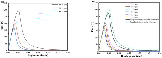 (a) Load–displacement curves (mechanical–chemical coupling); (b) load–displacement curve (mechanical–chemical coupling and degradation of material properties).