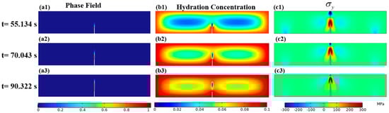 (a1–a3) The phase field, (b1–b3) hydrogen concentration diffusion, and (c1–c3) stress.