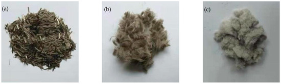 The BBF (Figure 1a) is produced by Jilin Tongxin Basalt Technology Co., Ltd. of Tonghua City in Jilin Province (China), which is generally brown and has a metallic luster; 200 to 400 filaments form a bundle. As a new type of environmentally friendly high-performance inorganic fiber material, basalt fiber has the advantages of high strength, low water absorption, acid and alkali resistance, high-temperature resistance and environmental protection.