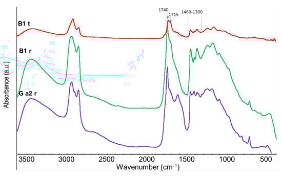 Reflectance and transmittance FTIR spectra of sample B1 (B1 r and B1 t) and reflectance spectrum of sample G a2 (G a2 r). For sample B1, the oil/mastic weight ratio is 50:50, whereas sample G a2 was prepared with a mixture of oil and hematite.
