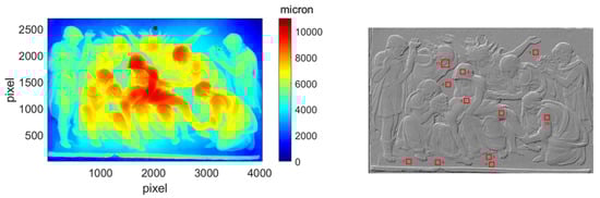 The relief, described in Section 2.1, features a reddish varnish with substantial craquelure. The 3D model was acquired by MP: a 50 μm sampling step was set for both X and Y scanning directions, and the resultant topographic map in colour scale is shown together with the raking light image produced from the 3D map in Figure 6a and Figure 6b, respectively. The term relief comes from the Latin relevare, ‘to lift’: creating a sculpture in relief means in fact giving the impression that the sculpted material has been lifted above the background plane. The coloured-scale map emphasizes the relief method where the sculpted elements stick to a solid base of the same material. Therefore, on the background plane at zero height, appearing in a blue shade in Figure 6a, a set of figures is superimposed at nearly 6 mm from the background, with the emerging central group (Christ and female mourners with outstretched arms) lifted in the range 7-10 mm from the background. The raking light image highlights the unevenness of the surface: the folds of the garments, the hair, and the veil are a shining example of relief and inlaid decoration. The lack of a flat surface and the presence of areas in relief with curved edges delimiting the characters did not allow for reliable EC measurements. Therefore, the only way for evaluating the varnish thickness was OCT: eleven ROIs (regions of interest) were selected to capture surface areas with different characteristics, from very smooth to very rough, from concave to convex regions, which are highlighted in red in the raking light image (Figure 6b). OCT measurements were then performed on eleven gauge volumes of size 4 × 4 × 1 mm3.