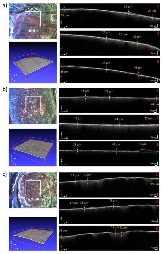 In Figure 7, the OCT results on ROI 4, 8, and 10 are reported, which were chosen as representative of the different surface morphology to evaluate possible differences in the patina layering. The charge-coupled device (CCD) camera snapshot shows the appearance of the surface under white light lighting, where the gauge volume analysed with OCT is highlighted in white. The 3D rendering shows the upper surface (xy section) of the acquired tomocube, where some characteristic markings such as small craters are recognizable. For each ROI, three cross-sections, highlighted in red, are then reported to show the huge variability in the patina characteristics. ROI 4 (Figure 7a), on Christ’s chest, although showing a smooth surface, is characterized by an uneven patina with a thickness in the 16–24 μm range, with regions reaching 32–48 μm where material accumulation is present. ROI 8 (Figure 7b), on the background between the faces of the two women holding Christ’s body, is characterized by an imperfectly smooth surface whose patina thickness ranges from 17 to 25 μm. At furrows, the thickness ranges from 44 to 83 μm. ROI 10 (Figure 7c), on the forearm of the woman holding Christ’s legs, has the most corrugated surface: the three cross-sections show the patina filling the holes as well as a nearly uniform layer (13–28 μm) covering the surrounding surface. In some craters, the OCT signal shows the presence of a highly scattering material, probably due to a mixture of patina, dirt, and metal corrosion products. Although the overall shape of the analysed surfaces is far from flat, OCT measurements were performed in a noninvasive and noncontact way, allowing the thickness of the patina to be determined at any point in the bronze relief. The imaging of the cross-section outlines the unevenness of the surface organic layer. In some limited portions of the cross-sectional tomograms (e.g., Figure 7c, slice 3), it is possible to see a second, very thin layer superimposed on the first one. This noticeable feature of the tomogram is worth exploring more deeply since it paves the way to noninvasive stratigraphic imaging of bronzes.