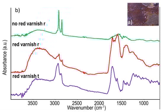 Detail of the reddish patina of Bertoldo’s relief (a), and (b) micro reflectance-FTIR spectra of areas with no varnish (top) and with varnish (middle). Reflectance spectra are reported together with microtransmittance spectrum (bottom) of a grain of the varnish. All spectra are normalized.