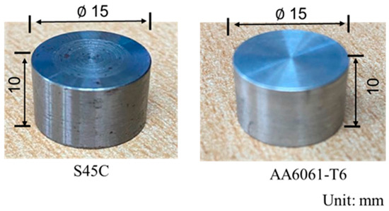 The specimens employed in the present study are cylindrical bulk metals of S45C and AA6061-t6 with a diameter of 15 mm and a height of 10 mm (Figure 1). The chemical compositions of the base materials (S45C and AA6061-t6) and the filler metal (Al718) are listed in Table 1. Prior to the EA-brazing experiments, the joining surfaces of the specimens were carefully polished using 320-grit and 600-grit sandpapers to remove the rust (on S45C steel) and oxide layers (on AA6061-t6). Finally, the specimens were thoroughly cleaned with acetone to remove any grease or dirt.