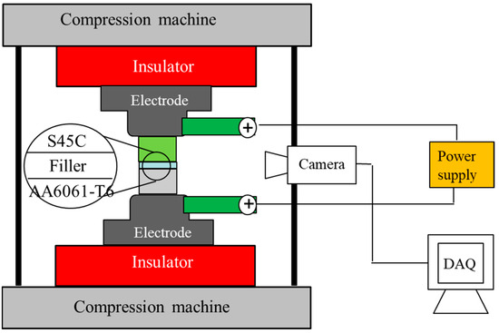 To prepare EA-brazing, the Al-based filler (0.1 mm thick) was cut into approximately circular shapes with an identical diameter as the EA-brazing specimens. A custom-made fixture was installed in a servo press machine, as schematically shown in Figure 2. Resistance heating was generated by direct current, which was produced using a programmable welder (VADAL SP-1000U, Hyosung, Seoul, Republic of Korea). A pair of electrodes was made of tool steel. To form a closed-loop circuit (the electrode, specimens, and direct current supply device), Bakelite insulators were placed between the electrode and the servo press machine.