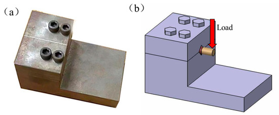 To further analyze the mechanical properties of the EA-brazing joints of S45C and AA6061-t6, the hardness properties of the EA-brazing joint of S45C and AA6061-t6 was evaluated using a Vickers indenter (HM-100, Mitutoyo, Kawaguchi, Japan) with a load of 2.94 N and a dwell time of 10 s. In addition, the EA-brazing joints were fixed on a homemade fixture (Figure 4), and their bending tests were performed using a universal testing machine (Jianzhuo Instrument Technology Co., Ltd., Suzhou, China). Cross-sections of the shear-tested EA-brazing joint were observed by SEM and analyzed by EDS.