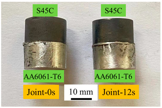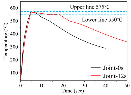 The AA6061-t6 temperature histories of Joint-0s and Joint-12s during EA-brazing were recorded, as shown in Figure 5. The temperature recorded at both EA-brazing joints increased from room temperature to 575 °C, which was lower than the melting point of AA6061-t6. The difference between both EA-brazing joints is that the temperature of Joint-12s was maintained between 550 °C and 575 °C for 12 s during the whole EA-brazing process time. Figure 6 shows that both EA-brazing joints with different temperature holding times were almost identical in appearance. Moreover, it can be seen that part of the filler was squeezed out between the steel and Al alloys during EA-brazing due to the thermal expansion of the specimens, which is why the temperature of Joint-12s cannot be kept constant.