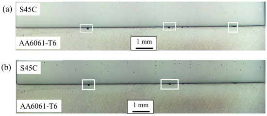 The cross-sections of both Al-steel dissimilar joints fabricated by the EA-brazing process are shown in Figure 7a,b. A clear interface between the steel and Al alloys was found in both EA-brazing joints. In addition, a few defects of various sizes (average size: 82.5 ± 9.3 μm) were observed at the Al/steel interfaces and characterized with an approximate ellipse, as marked by white rectanglein in Figure 7. One reason for the formation of voids on the surface of Al alloys is the poor contact between the specimens and the filler, which resulted in an excessive local temperature. Since the melting point of Al alloys is significantly lower than that of steel, the generation of high temperatures can cause the local melting of AA6061-t6 at the joining surface. The shrinkage of the melted filler during re-solidification is another cause of the defects at the joint interface [21]. Even so, the microscope defects were not observed in most interface areas of either joint.
