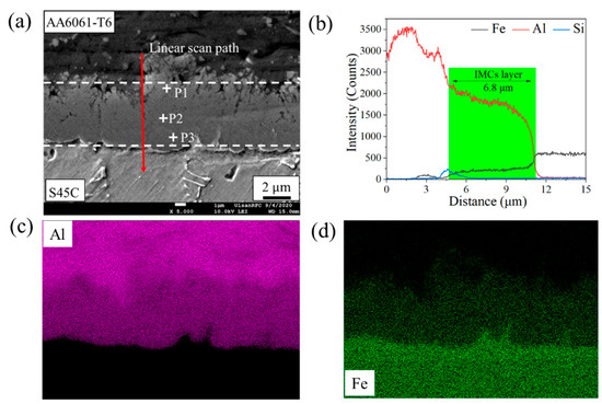 To further evaluate the joining area where no defects were observed by OM, the SEM images (Figure 8a and Figure 9a) of the cross-section of both EA-brazing joints were analyzed. These results revealed that no microscopic defects were observed at the interface of either joint. Also, a distinct interlayer with different colors between the S45C steel (bright region) and AA6061-t6 (dark region) was observed at the interfaces of both the EA-brazing joints. The interlayer on the steel side at the interface of both joints between Al and steel (Figure 8a and Figure 9a) had a relatively smooth boundary. In contrast, the interlayer on the Al alloy slide at the Al/steel interfaces of Joint-0s and Joint-12s observed from the two SEM images present an evident difference in shape. The interlayer of Joint-12s (Figure 9a) at the Al alloy side formed a more significant needle-like shape compared with that of Joint-0s. This could be explained by the fact that elements of Joint-12s at the interface of the filler and AA6061-t6 were promoted to diffuse due to more heat input caused by the 12 s holding time [22].