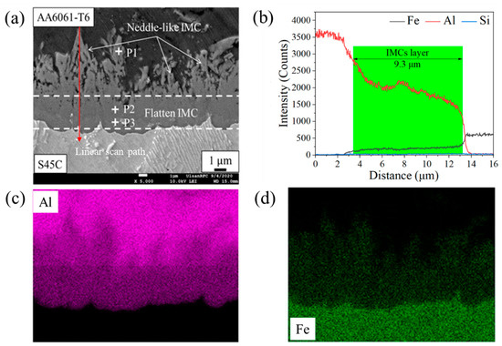 The mechanical properties of the EA-brazing joints were evaluated using the hardness and bending tests. The microhardness profiles of both EA-brazing joints (Figure 10a) were approximately identical. For both EA-brazing joints, no significant change in hardness was found on the steel side compared with BM S45C (248 ± 9.8 HV). However, the hardness on the Al alloy side (78.5 ± 3.6 HV) was lower than that of BM AA6061-t6 (110 ± 4.2 HV). This softening BM AA6061-t6 could be understood as the dissolution of precipitates caused by the elevated temperature (575 °C) [22]. As shown in Figure 10b, the shear load and IMC layer thickness were simultaneously enhanced by increasing the holding time. The shear load of Joint-12s (1260 ± 48 N) was higher than that of Joint-0s (1090 ± 42 N) due to the temperature holding time of 12 s. The thickness and type of IMCs are responsible for the mechanical properties of EA-brazing joints of steel and aluminum alloys. An IMC layer that is too thick (greater than 10 μm) tends to cause fatigue crack initiation [13]. In addition, a large amount of embrittlement IMCs, such as FeAl2, FeAl3, and Fe2Al5, can significantly reduce the strength of the joint [16]. Therefore, the mechanical properties of the joints of steel and Al alloys can be optimized by adjusting the thickness and type of the IMCs. In this present study, the higher mechanical properties of Joint-12s depend on the relatively thick IMC layer (smaller than 10 μm) and the existence of Fe-rich IMCs (FeAl) compared with Joint-0s [29,30]. The SEM images of the cross-section and corresponding EDS line scanning of the broken Joint-12s are shown in Figure 11. Almost no residual IMCs (Figure 11a,b) were observed on the fracture surface at the S45C steel side; in contrast, the thickness of the remaining IMC layer (Figure 11c,d) on the AA6061-t6 side was measured to be approximately 8.2 μm. Therefore, the bending fracture failure of Joint-12s mainly occurred at the interface between the S45C steel and the IMC layer. This result could be explained by the mechanical interlocking structures formed by the IMCs with needle-like shapes and AA6061-t6.