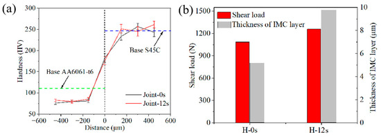 Mechanical properties of EA-brazing joints: (a) hardness profiles; (b) shear load.