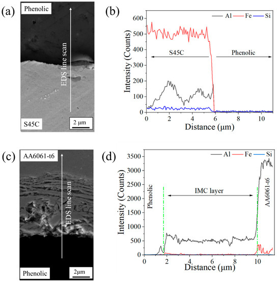 SEM images and elemental line scans of Joint-12s after bending test (a,b) at the S45C side and (c,d) at the AA6061-t6 side.