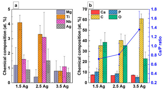 - Cardoso, G.C.; Barbaro, K.; Kuroda, P.A.B.; Imperatori, L.; De Bonis, A.; Teghil, R.; Curcio, M.; Innocenzi, E.; Grigorieva, V.Y.; Vadalà, G.; et al. Incorporation of Ca, P, Mg, and Zn Elements in Ti-30Nb-5Mo Alloy by Micro-Arc Oxidation for Biomedical Implant Applications: Surface Characterization, Cellular Growth, and Microorganisms’ Activity. Coatings 2023, 13, 1577. [Google Scholar] [CrossRef]