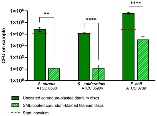 Viable bacteria retrieved from the discs in the antibacterial activity test after 24 h of culture. Uncoated corundum-blasted (CB) titanium discs are represented by dark green bars, and SML-coated CB titanium discs are represented by striped light green bars. The starting inoculum is represented by the red dotted bar. Statistically evaluated with an unpaired t-test. ** p < 0.01; **** p < 0.001. The data represent the average means and standard errors of three separate repeated experiments with triplicate samples for each experimental group.