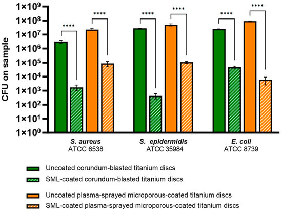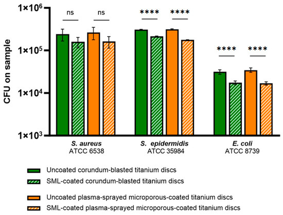 The number of bacteria attached to the sample surface after 1 h of incubation. Green bars represent corundum-blasted (CB) titanium discs and orange bars represent plasma-sprayed microporous-coated (PS) titanium discs. Striped bars show the data of the SML-coated discs. Statistically evaluated with an unpaired t-test. ns p > 0.05; **** p < 0.001. The data represent the average means and standard errors of three separate repeated experiments with triplicate samples for each experimental group.