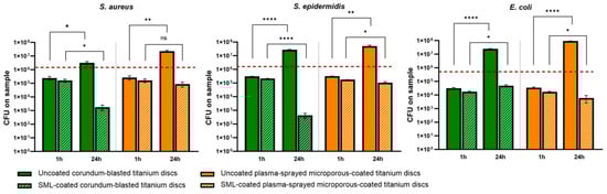 Viable bacteria on the discs after 1 h of bacterial adhesion and 24 h biofilm formation, indicating bacteriostatic or bactericidal coating properties. The red dotted line indicates the starting inoculum level. Green bars represent corundum-blasted (CB) titanium discs and orange bars represent plasma-sprayed microporous-coated (PS) titanium discs. Striped bars show the data of the SML-coated discs. Statistical evaluations between groups indicative of bacteriostatic or bactericidal properties were performed with an unpaired t-test. ns p > 0.05, * p < 0.05, ** p < 0.01, and **** p < 0.001. The data represent the average means and standard errors of three separate repeated experiments, with quadruplicate samples for each experimental group.