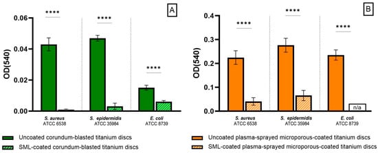 Biofilm biomass assessed by means of safranin staining (OD540) on uncoated and SML-coated (A) corundum-blasted (CB) and (B) plasma-sprayed microporous-coated (PS) titanium discs, after 24 h of biofilm culture. **** p < 0.001. No biomass was found on the SML-coated PS discs inoculated with E. coli (n/a). The data represent the average means and standard errors of three separate repeated experiments with triplicate samples for each experimental group.