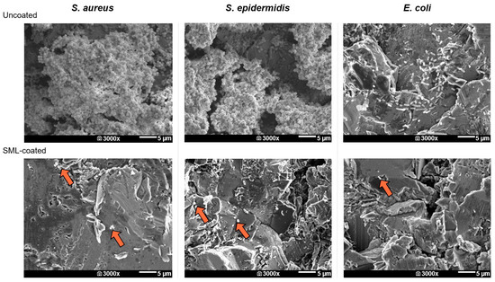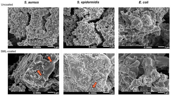 Corundum-blasted (CB) titanium discs after 24 h biofilm culture, with the uncoated discs (upper row) and SML-coated discs (bottom row) for all three bacterial strains divided per column. Orange arrows point out individual bacteria on the SML-coated discs. The magnification bars represent 5 µm.