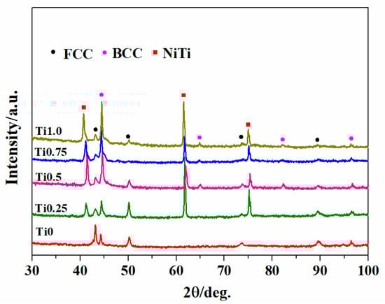The XRD results of CoCrFeNiMoTix HEA coatings are shown in Figure 1. The composition of the CoCrFeNiMo coating primarily consists of FCC and BCC solid solution phases. After adding the Ti element, the new NiTi phase is generated. Based on the mixing enthalpy results in Table 1, the mixing enthalpy between Ni and Ti in the CoCrFeNiMoTix high entropy alloy coatings can be concluded as the most negative value (-35 kJ/mol), indicating that Ni and Ti elements are most easily combined to form the new NiTi phase. The maximum number of phases achievable determined based on the Gibbs phase rule “p = n + 1” during equilibrium solidification of CoCrFeNiMoTix coatings is 7. Obviously, this is inconsistent with the above results, which is mainly because of the unique high entropy effect in CoCrFeNiMoTix high entropy alloys [22]. Referring to the Gibbs free energy equation “”, under other unchanged conditions, as the entropy value increases, the free energy decreases, resulting in a more stable system. Solid solution phases have the high mixing entropy, so CoCrFeNiMoTix high entropy alloy coating is more prone to generate solid solution phases, and only consists of three simple phases of FCC, BCC, and NiTi phases. In addition, Figure 1 illustrates that as the Ti content rises, the peak strength of the BCC phase gradually increases, while that of the FCC phase gradually decreases. This means that the BCC phase content experiences a gradual increase, while the FCC phase content undergoes a gradual decrease.