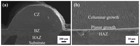Figure 2 shows the typical cross-sectional morphologies of CoCrFeNiMoTix high entropy alloy coatings. Based on the observations in Figure 2a, the coating can be distinguished into four distinct regions: the cladding zone (referred to as “CZ”), the bonding zone (referred to as “BZ”), the heat-affected zone (referred to as “HAZ”), and the substrate (referred to as “substrate”). The height from the highest point of the layer to the substrate is approximately 1.2 mm, which is basically equivalent to the thickness of the preset powder. In addition, there are no obvious defects including pores and cracks appearing on the coating, indicating that the laser cladding process parameters are appropriate. And during the process of presetting the powder, the powder is dry and completely compacted, so there are no bubbles generated during the laser cladding process. Meanwhile, the molten pool does not generate excessive stress because of the rapid cooling velocity of laser cladding, resulting in the high forming quality of high entropy alloy coating and good bonding of coating and substrate.