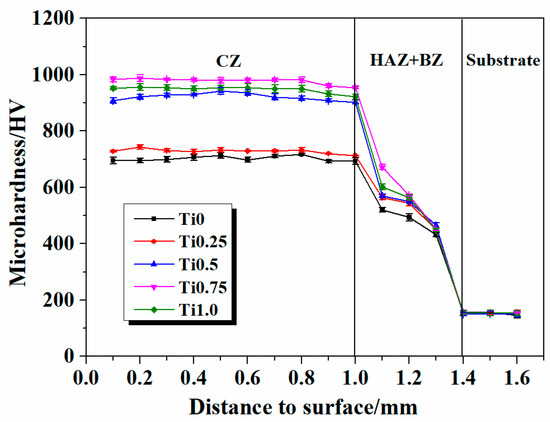 Figure 4 illustrates the distribution of microhardness of CoCrFeNiMoTix high entropy alloy coatings. The hardness distribution curve can be segmented into three distinct regions: namely the CZ, the HAZ+BZ, and the Q235 steel. There is a noticeable decrease in hardness from the surface of the coatings to the underlying substrate. The hardness change trend of the laser cladding layers is gentle, further indicating that the microstructures of coatings are evenly distributed and the performance is basically consistent. Based on Figure 4, it is evident that the increase in Ti content (0 ≤ x ≤ 0.75) leads to a gradual improvement in the hardness of CoCrFeNiMoTix coatings. In particular, when the Ti content reaches 0.75 at.%, the average hardness of the coating reaches its peak at 950 HV, which is approximately 6.5 times higher than that of the substrate (Q235 steel, 150 HV). This is mainly due to the increased content of the relatively hard BCC phase and NiTi phase.